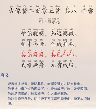 嗟乎!望崦嵫而追日影,临河西想见遗踪。丹陵寂寂而圣迹犹存,钧天渺渺而德音未绝。今撰玄珪,仰止高风。辞曰: