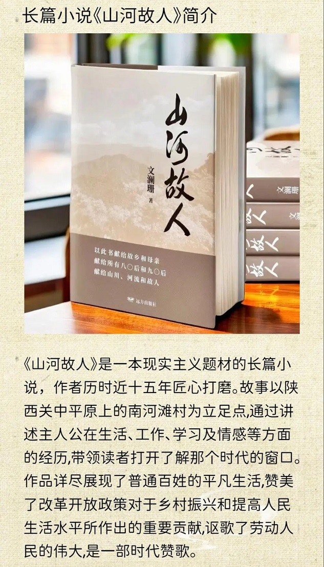 《山河故人》是一本现实主义题材的长篇小说,由陕西籍作家文澜珊历时近十五年匠心打磨而成。故事以陕西关中平原上的南河滩村为立足点,通过讲述主人公在生活、工作、学习及情感等方面的经历,带领读者打开了解那个时代的窗口。作品详尽展现了普通百姓的平凡生活,赞美了改革开放政策对于乡村振兴和提高人民生活水平所作出的重要贡献,讴歌了劳动人民的伟大,是一部充满时代气息的赞歌。