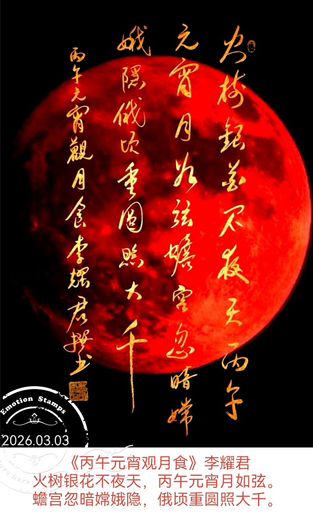 我忽然想起新闻里说:整个21世纪,能看到的元宵节月全食,只有2007年、2026年和2072年这三次。上一次,是十九年前,那年我41岁,是我到北京工作的第二年,据查,那天的“月食”是在清晨5时30分至8时许,当时应该没有观赏;1990年也曾有一次,当时的“食甚”在凌晨3时许,当时应该也没有观赏。而下一次,是四十六年后。四十六年……那时候如果我还在,该是106岁了,不知道还会不会像今晚这样,站在楼顶上,静静地看月亮一点点被吞没,又一点点复圆。