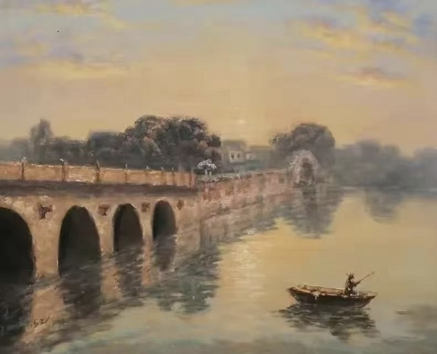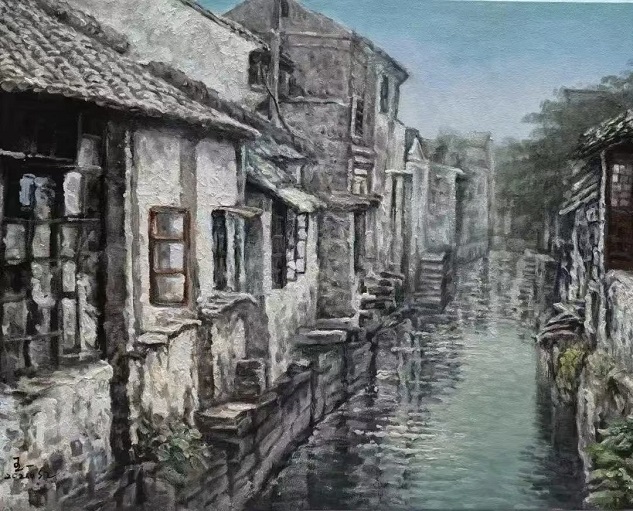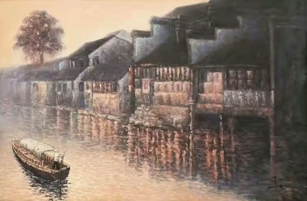 作为从镇江走出、定居苏州的画家,王一始终对江南水乡怀有深厚的感情。他笔下的西津渡、太湖、乌镇、苏州山塘,都充满了静谧纯美的气息。细腻逼真的造型,和谐稳重的构图,冷暖色调的巧妙搭配,光与影的自然组合,让他的水乡风景油画清新灵透、雅俗共赏。尤为值得称道的是,王一在油画技法上独创了“水韵皴法”,将中国传统水墨的写意精神融入西方油画的表达之中。以皴取形,以水润象,线面皴擦之间层次丰富、虚实交融,赋予画面全新的审美体验。著名书画艺术评论家唐辉评价道:“他不屑于被西方油画的既定形式牵着鼻子走,也从不拘泥于任何陈规定式,而是真正实现了创作上的自由境界。”