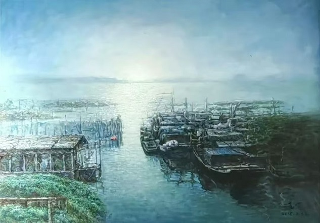 如果说足球主题展现了王一激情澎湃的一面,那么他的江南水乡系列作品,则流露出深沉细腻的乡愁与诗意。水韵皴法的艺术价值,不仅在于技法的创新,更在于其承载的深厚文化内核与人文情怀。王一生于镇江、长于江南,江南水乡的烟火气息、烟雨景致,是刻在他骨子里的乡愁,也是他创作的永恒源泉。他以水韵皴法描绘的江南,不只是地理意义上的水乡,更是中国人心中的精神原乡,是对传统文人山水情怀的当代延续,也是对地域文化符号的艺术升华。作为当代中国油画界极具辨识度的艺术技法,水韵皴法的价值,早已超越了个人风格的范畴,成为中国当代油画跨界融合的典范,具有不可替代的学术价值与时代意义。