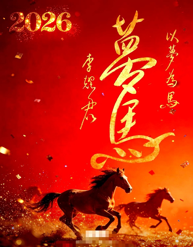 时维丙午,马跃新春。骥足腾云,展宏图于盛世;鸿猷启泰,兴伟业于良辰。愿此春节之庆,融和四海;冀我中华之兴,光耀八垠。纳千祥于宇内,聚万福于家门。岁岁常欢愉,年年皆胜意;山河无恙,国泰民安;文脉永续,福暖乾坤!