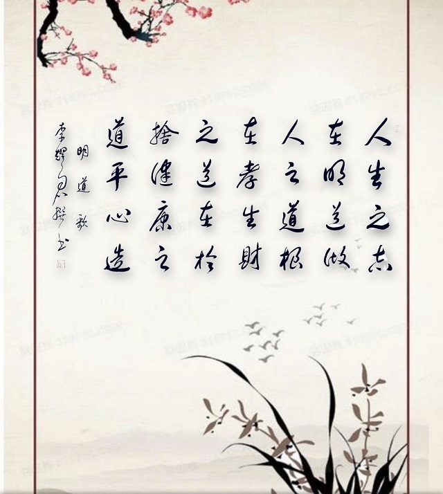 天地确立法则,孝道是道德的首位;华夏传承宗脉,仁爱以孝道为根源。《孝经》流传下来的训示,是立身处世的根本;《论语》中十九处讲到孝悌,《百孝篇》用八百字劝人慈爱安宁。古代传下二十四孝的故事,在史册中流芳百世;如今确立新二十四孝的规条,在人间焕发光彩。孝的道理,贯穿古今不会改变;孝的法则,通达天地而永恒存在。