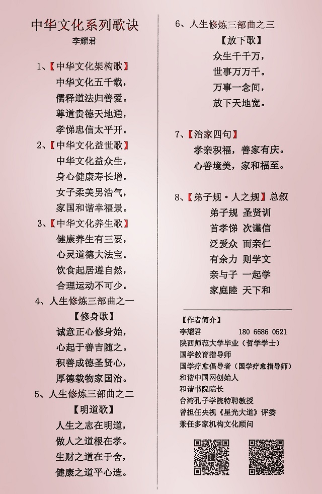 【附:作者简介】李耀君,1966年出生,陕西渭南人,陕西师大政教系(哲学)毕业,人文学者,国学教育指导师,“国学疗愈”倡导者(国学疗愈指导师),和谐中国网创始人,《弟子规▪人之规》现代修订者,和谐书院院长,台湾孔子学院特聘教授,曾担任央视《星光大道》评委,兼任多家企事业单位文化顾问。撰有《中华文化系列歌诀》《国学经典导读》和《国学疗愈》《人文随笔》等。中央电视台、《人民政协报》和《联合国友好画报》等媒体先后报道。
